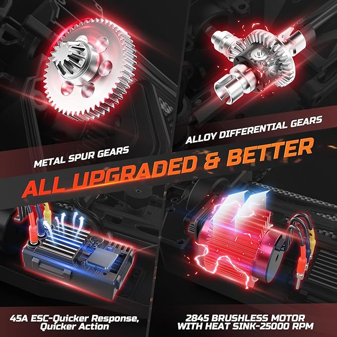 - 【Unmatched All-Terrain Dominance】: From grippy rubber tires to shocks, every bump and jump is smooth sailing. A fully metal integrated chassis, protective steel sheet reinforcement and metal drive shafts? That's rock-solid durability right there. And let's not forget the metal spur and differential paired with metal bearings – this truck doesn't just drive, it glides. With an independent suspension front and back, expect nothing less than the smoothest ride.