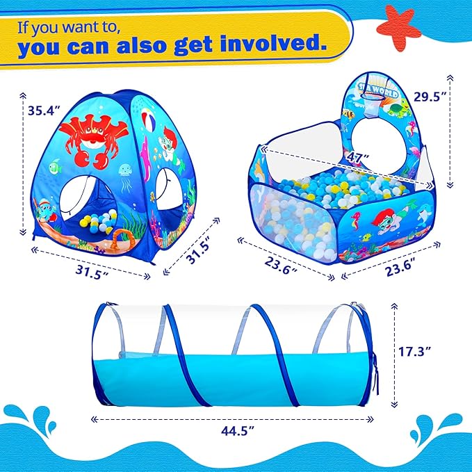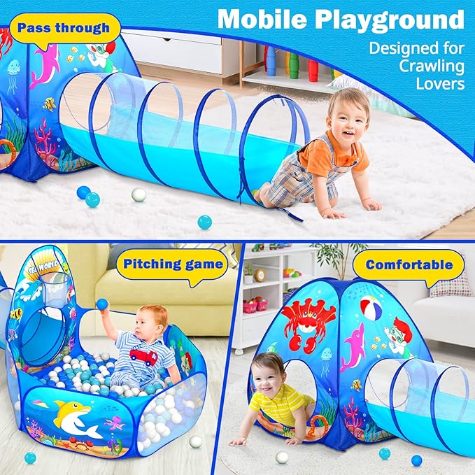 - Endless Fun: Children love this 3 in 1 ball pits for toddlers, which is composed of unique shape play tent and baby tunnel. Throwing the balls for ball pit into the basket hoop encourages kids physical play and stimulates the imaginations at any time. Let your baby's imagination grow wildly with this perfect toddler playset