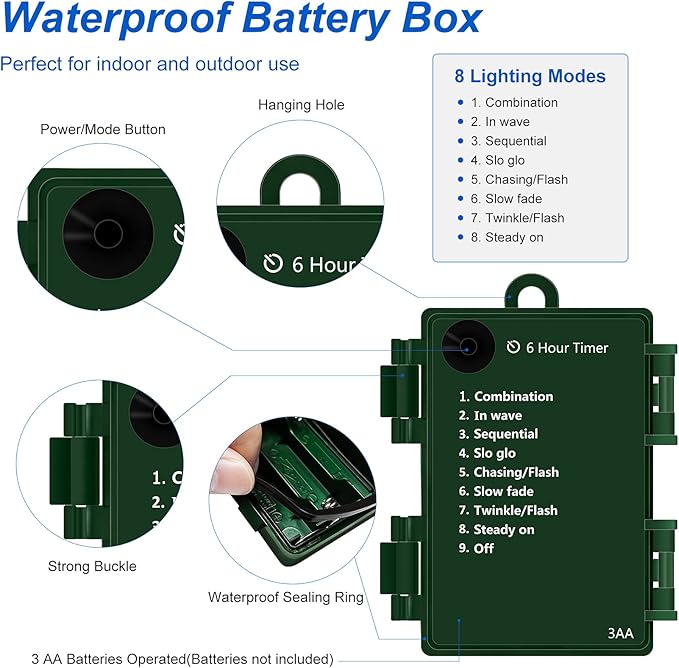 - Outdoor and Indoor Christmas Lights: Battery box and string lights are waterproof(3*AA size battery, NOT INCLUDED), these are perfect to use on indoor and outdoor. Easy and great decor for Christmas tree, outdoor trees, wreaths and garland.