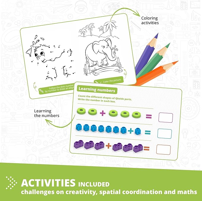 - ADDITIONAL ACTIVITIES INCLUDED: Challenges on creativity, spatial coordination and math. Includes coloring and learning numbers activities. LEARNING FACTS included for each model to be created.