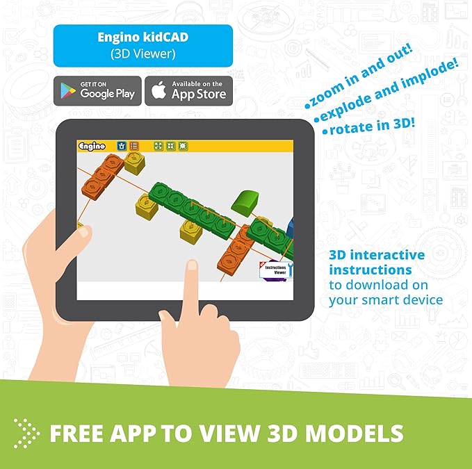 - STACK & CLICK STSTEM: Increase dexterity and perception of 3D space! Vertical and sideways assembly. Enhanced creativity by connecting bricks with beams in any direction. 3D MODEL VIEWER: Compatible with the Engino app.