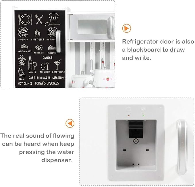 - 🧑🍳【Complete Kitchen Accessories】This kids kitchen playset comes with a sink, simulated oven, convenient cabinets, refrigerator, water dispenser with realistic lights and sounds, vintage phone, including 1 pot with a lid, 1 pan, and 3 wooden cookers.