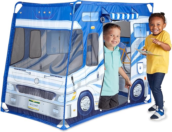 - 47” x 31” x 39” (assembled) camper-shaped play tent with door and roof flaps, screen windows, and lots of realistic details