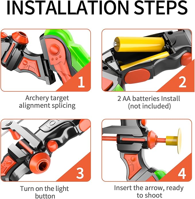 - Night LED Light Cool Toys - This archery set with LED lights is suitable for indoor activities and outdoor games. After inserting 2 AA batteries (not included), press the button to turn on the LED light, allowing you to easily track the arrow at night and enjoy a wonderful shooting game.