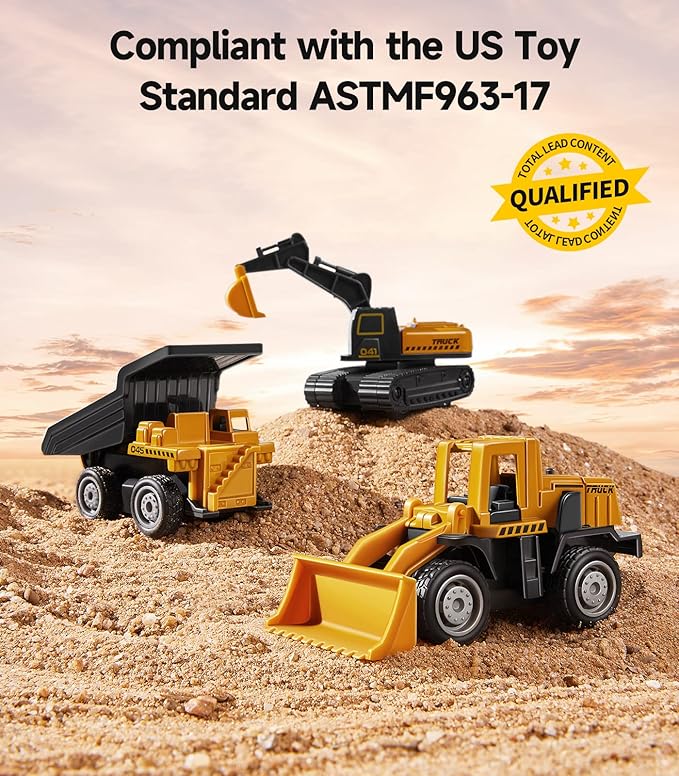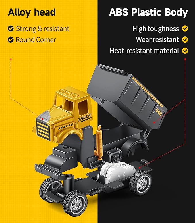 - Luxury Engineering Trucks: Truck head made of heavy duty Alloy metal Material, other parts made of Plastic ABS rubber tire. All are durable and non-toxic, smooth, no share corner, safe for kids.