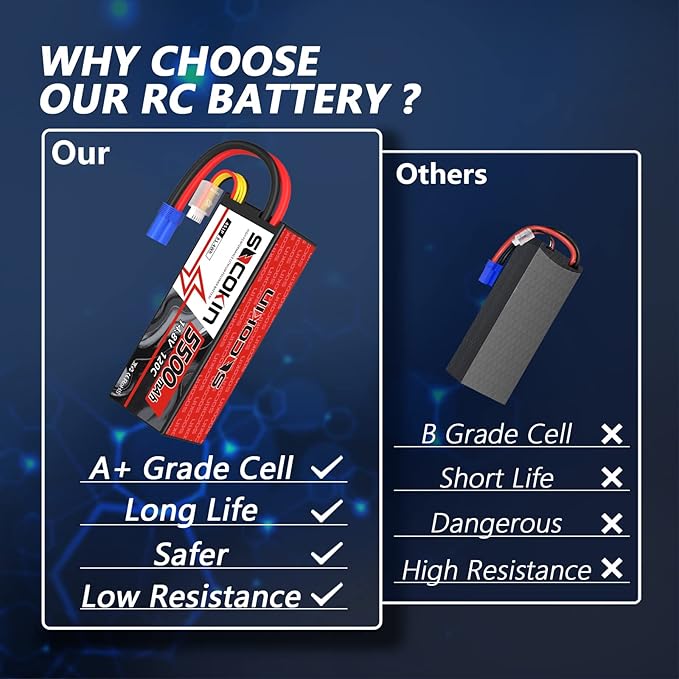 - 【What You Get】2 * Socokin 5500mAh 120C 14.8V hard case RC Lipo battery.Any issues about the battery,please enter YOUR ORDER for help or contact us via our customer service email, we will reply within 24 hours.