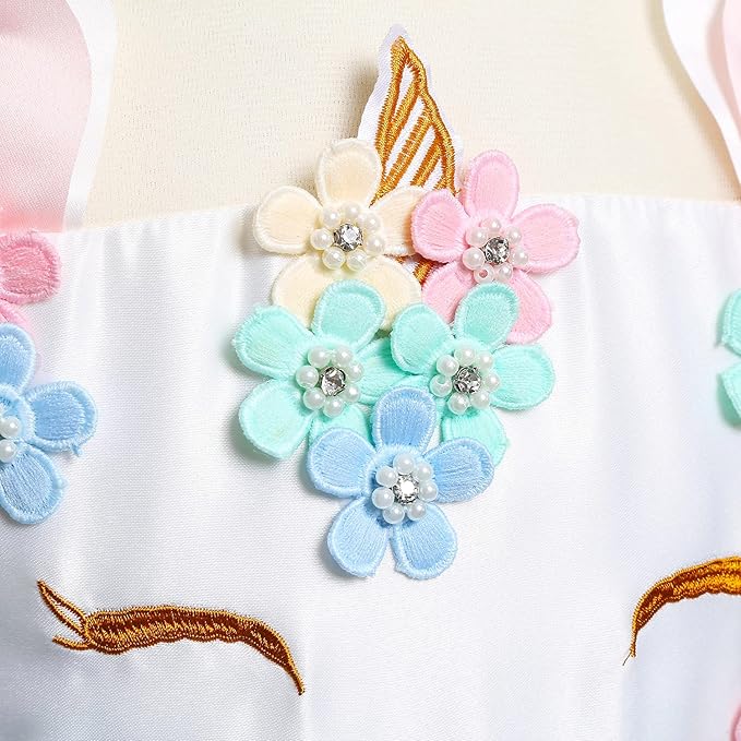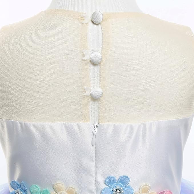 - Excellent design:fancy unicorn dresses for girls with Rainbow colors , Invisible zipper opening and closing , chic flowers , and the details of the princess costume for girls are very beautiful.