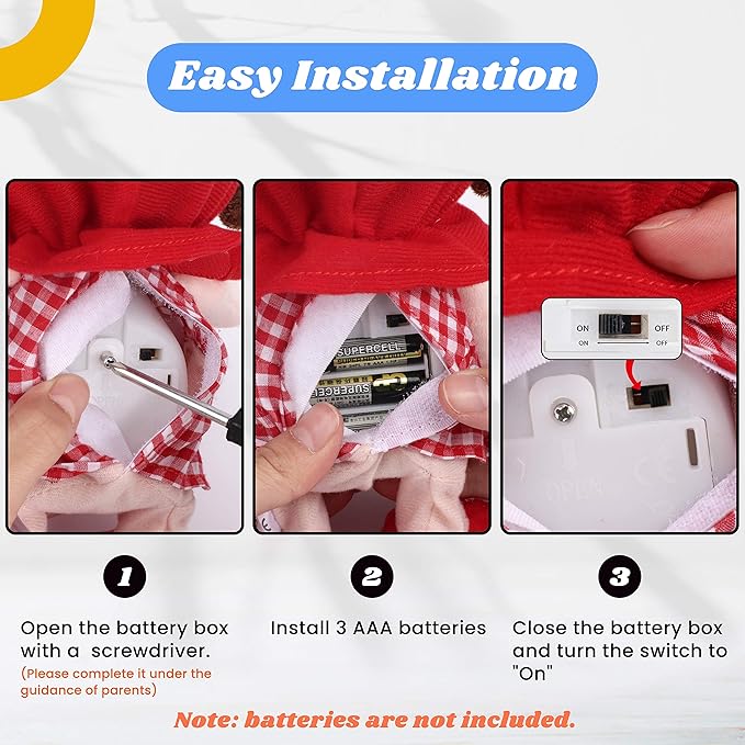 - CONSIDERATIONS: Adults should open the battery box with a screwdriver. Put in 3 AAA batteries (NOT INCLUDED), and turn the switch to “ON”. Then just ask your kids to press the button on the hand of the unicorn. Please remove the batteries if for long time storage and keep it away from fire and water for safety reasons. Do not wash it. If you have any questions about the problem, please don’t hesitate to contact us. We’ll response in 24 hours.