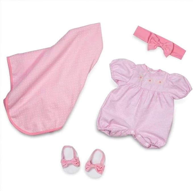 - What’s Included: Daisy May comes with a seersucker bubble romper with 3 white daisy appliqués, pink bow sandals and a headband, a pink polka-dot blanket, and a magnetic pacifier.