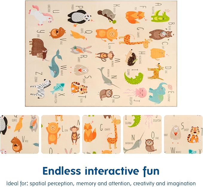 - A Decorative Learning Oasis: Transform your classroom or preschool into a lively learning oasis. The rug’s colorful and engaging design breathes life into group activities, captivating children’s attention. With a variety of animals like zebras, monkeys, and pandas, kids will love matching them to the bold, vibrant letters, creating an environment where learning is a joyful adventure
