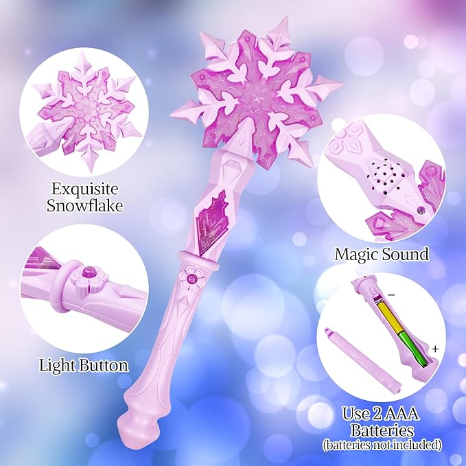 - EYE-CATCHING LIGHTING: These magic wands are full of fascinating light effects, press the button, the snowflake of the wand top will change 6 different colors