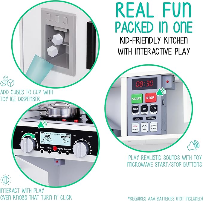 - SUPER REALISTIC SIGHTS & SOUNDS | Much More Than a Toy, Our Interactive Design Enables Meaningful STEM Learning as Boys & Girls Immerse Themselves in a Real Kitchen Setup | Elements Include Pretended Ice Dispenser, Microwave with Light & Sounds, Stove Top with Realistic Sound and light, Battery Operated Range hood, Lighting oven, Clicking Knobs, Twisting Dials, Labels & More