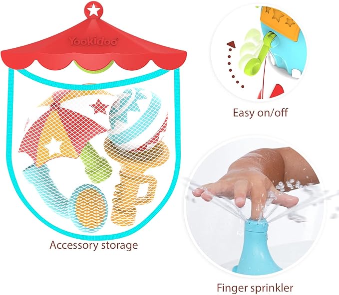 - It's sprinkling time! This battery-operated elephant bath toy will wow kids with its 3 interchangeable accessories that creates different water effects plus a colorful ball that lets them play in the water, and the bathtub organizer keeps toys and more within reach.