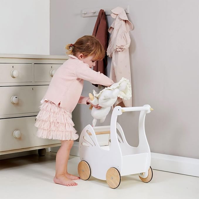 Tender Leaf Toys - Sweet Swan Pram - Wooden Swan Shape Dolls Stroller - Inspired Role-Play Toy for Boys and Girls, Improve Gross Motor Skills and Creativity - Age 18m +