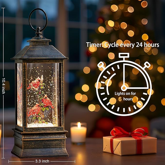 - 🎄🔮🎁included in the package: Snow Globe Inside are 3 beautiful red cardinals perched on a branch with holy, for our devoted bird lovers, in swirling glitter. When turned on a warm LED shines down on the figurines and swirling glitter to gives our Cardinal water lantern a whimsical look for the Christmas Holiday season.