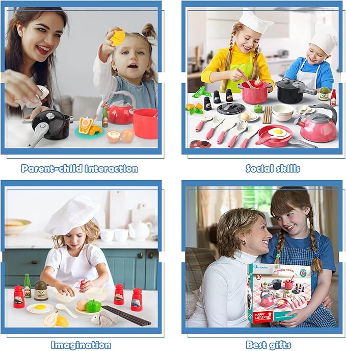 - 【Realistic Kitchen Playset & Food】Realistic cooking set encourages imagination, dexterity, and creative play, Teaches your little ones to be mother's little helper. The kettle can be filled with water and the spout can be pulled out, Give your child a gift that creates countless happy moments!