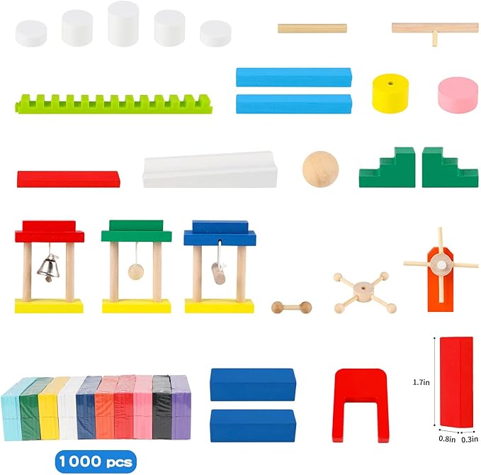 - PACKAGE INCLUDED: This bulk dominoes set included 1000 wooden dominoes, there are 10 different colors and packaged by color, you can open 100 at a time. It comes with a red bag to storage dominoes, and there are 11 additional wooden toys (ramps, stair steps, swings, etc.) , that can enhance kids experience, add to the fun. Package size: 16.65*12.48*3.15 inch, Single domino size: 1.7*0.8*0.3inch.