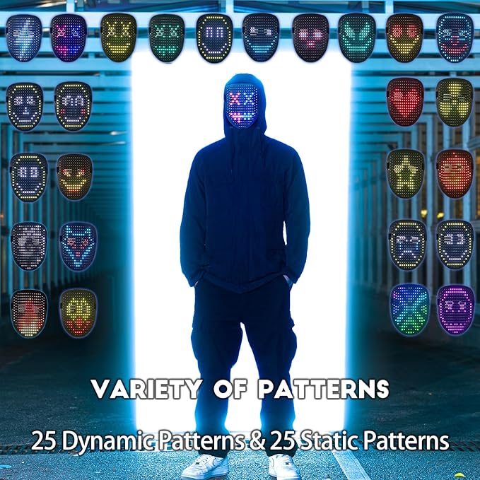 - [50 Patterns Fantastic Display]: Led Mask has 25 dynamic display modes and 25 static display images, led full face mask is Most Amazing Costumes&Cosplay apparel mask, attract everyone's attention.