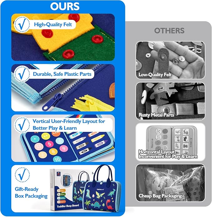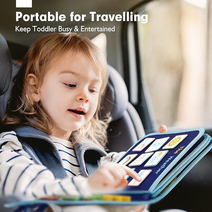 - 【Portable Travel Toys】The 11×9 inches size perfectly fits most diaper bags. Furthermore, there's a removable zipper design on cognitive boards, and it has a sturdy handle for easy carrying. It will be an excellent choice for travel activities and toddler toys. If you are looking for a busy book for toddlers 1-3, ours is definitely the perfect gift ideal that's not messy, noisy or screen time.