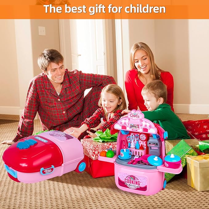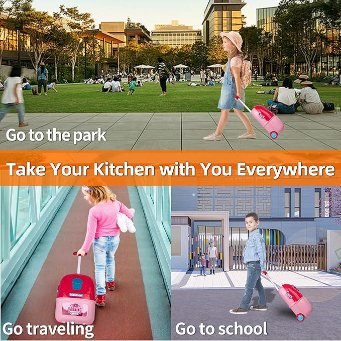 - Perfect for On-the-Go Play: Thanks to its rolling suitcase design, this kids play kitchen is portable and travel-friendly. Whether at home, in the car, or at a playdate, your child can enjoy cooking fun wherever they go. It's ideal for families on the move.