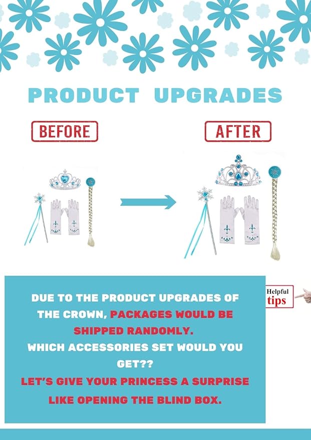 • Rich accessories with tiara, wand, wig, gloves. Exquisite princess dress up accessories set is decorated with glitter details, paired with a blue artificial gem and silver edge, matching perfectly with elegant elsa white gloves, making an amazing gift for your little princess, friends or any Elsa enthusiast!