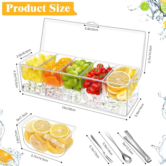- Ingenious Condiment Server Set: The set includes 1pc lidded 5 Compartment Condiment Tray (15.15"L x 5.51"W x 4.92"H), and additionally comes with 2 serving tongs, 5 utility ice scoop, 5 forks, which is a combination of practicality and convenience