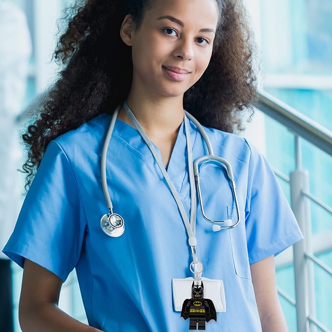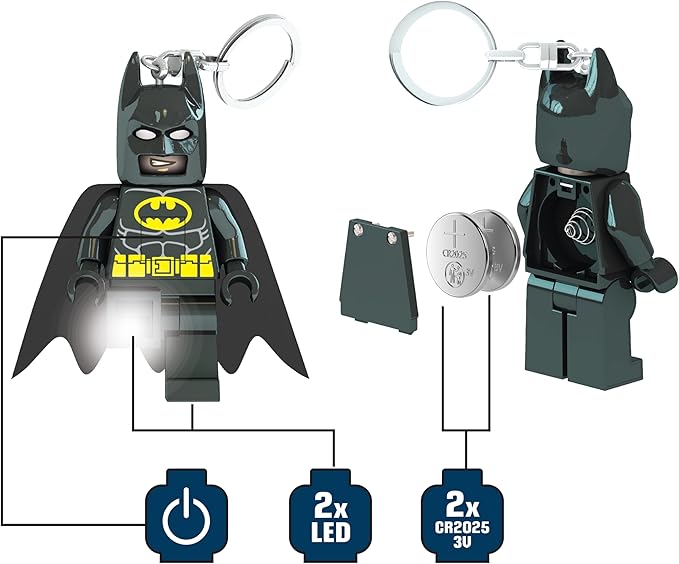 - Show off your inner bat with the LEGO Batman Keychain Light. Figure measures approximately 76mm (3 inches) tall and is a 175% scale replica of the LEGO minifigure. Powered by 2 CR2025 batteries (included), simply hold the on/off button in the chest to activate the LED light in each foot. The metal key ring is easy to attach to a lanyard for quick access in dimly lit areas. Figure is fully posable with movable head, arms, hands and legs and makes the perfect gift.