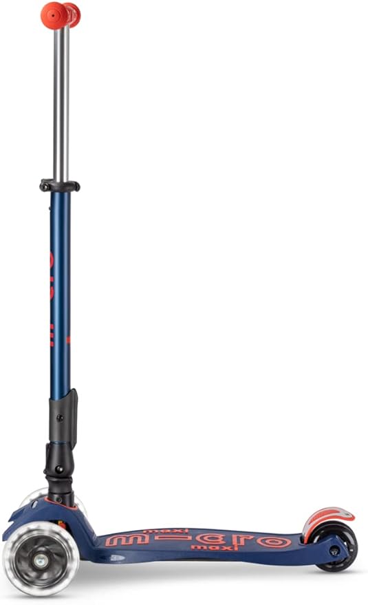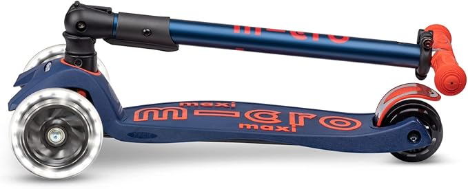 - Micro's newly upgraded Maxi Deluxe Foldable LED features motion-activated light-up front wheels and a foldable T-bar for easy carrying & travel. Created with a lean-to-steer design, offering a stable ride that supports children as they curve and carve the sidewalk.