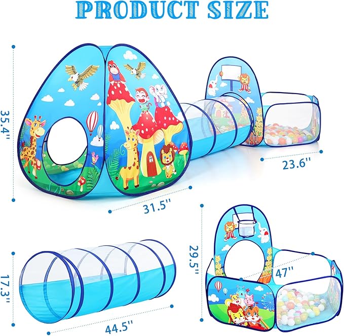 - Roar Through the Tunnels: With a cool design, our 3 in 1 kids tent is perfectly for girls and boys, and also good idea Birthday Parties, picnics, carnivals, and Sleepovers and so on. Your little ones will have a time of their lives playing in the kids play tent, crawling through the tunnel, or jumping endlessly in the pit with balls