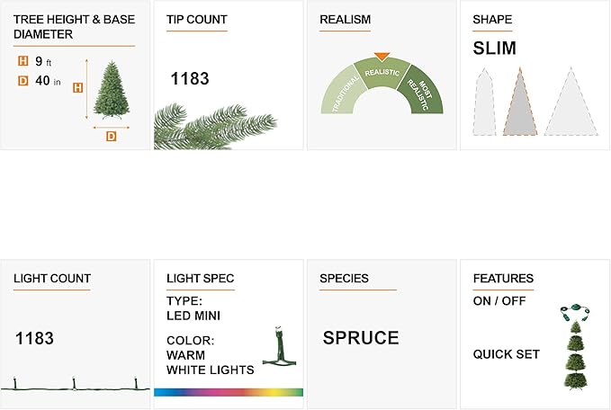 - 🎄IDEAL SIZING】: The artificial Christmas tree stands 9 feet tall and 3.5 feet in diameter at the base. Length of extension cord: 59 inch. Product may ship compressed -You can adjust all the branches with an elegant look like the images.