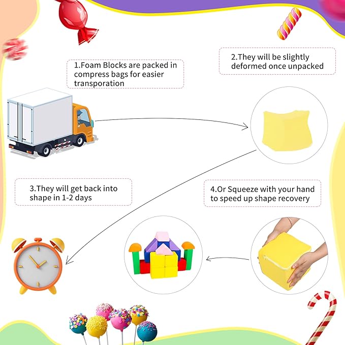 - FOAM PLAY SET -- The kids foam blocks are compressed packaging and will be deformed a little once unpacked. They will regain their shape in 1-2 days or you can squeeze and slap the sides to speed up the recovery