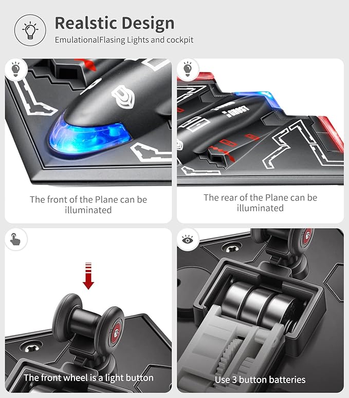 - 【Realistic appearance】Catch kids’ attention with the super cool LED flashing light. The fighter jet toy has a transparent cab and its taillight can be folded up. The plane surface has a concave-convex design texture and high temperature electrostatic baking paint process.