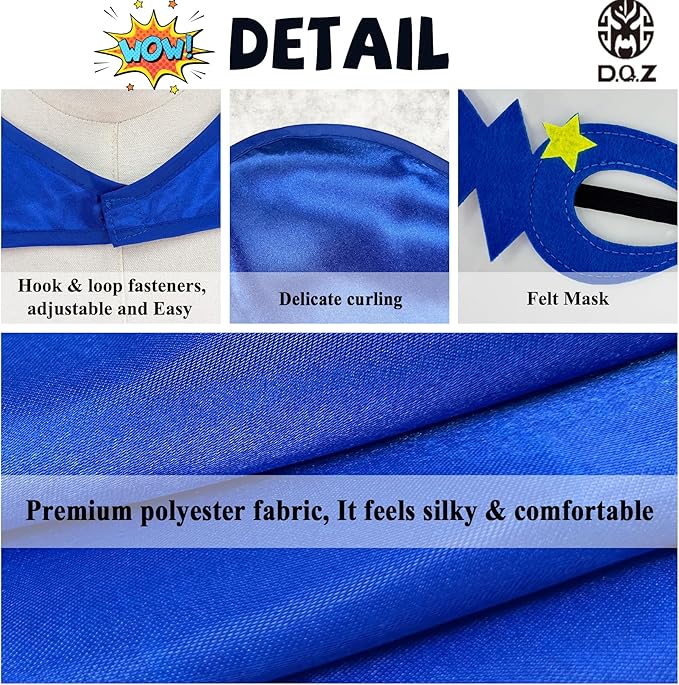 - Polyester Material: Kids Super Hero Capes, made of satin, Bright and comfortable; superhero masks is made of felt fabric so they are soft for little faces, last for many days. The buckle fastener at the neck safe and easy to put on and off by kids.