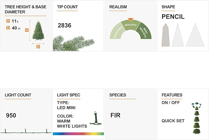 - 🎄IDEAL SIZING: The artificial Christmas tree stands 11 feet tall and 3.3 feet in diameter at the base. Elegant pencil fir without taking much space. Product may ship compressed -You can adjust all the branches with an elegant look like the images.