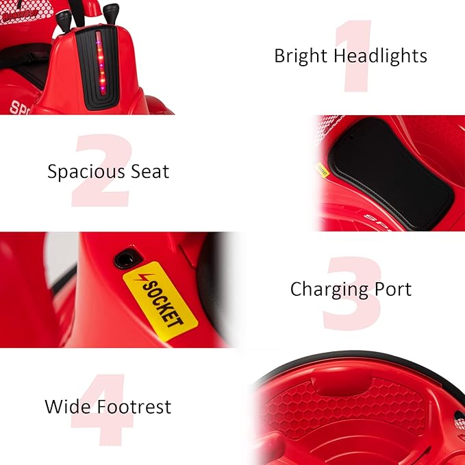 - 【Interesting Music & Light Effects】Light-up LED edging and colorful headlights make it more attractive. Horn, built-in music and story bring more fun during kid’s driving process. Besides, USB port of the control panel allows you to connect other outer devices for more music options.