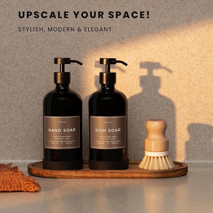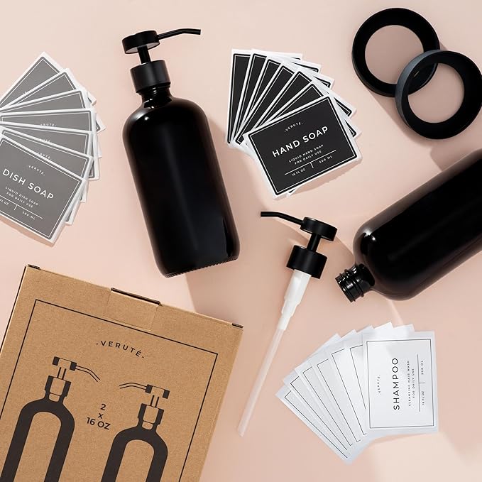 - ORGANIZE YOUR HOME - Inside the set: 2 16oz glass bottles for your creams and liquid soaps; hand soap, dish soap, lotion, body wash, conditioner, shampoo and face wash labels in white, gray, and black colors; and 2 silicone trays.
