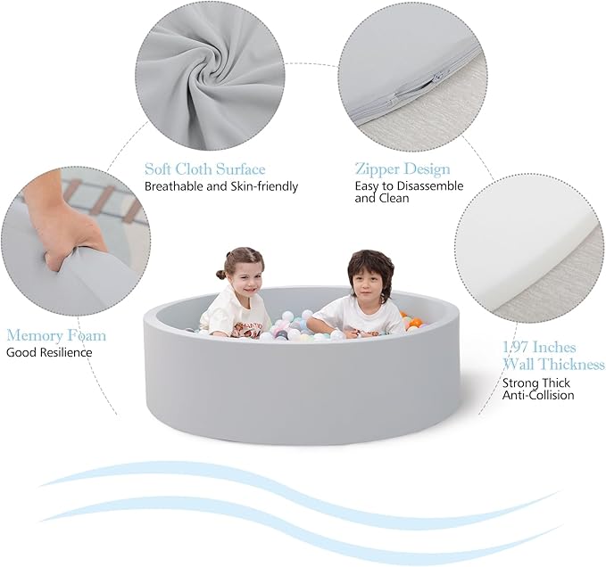 - [Safe and Comfortable] Baby ball pits inner material is made of 2 inches thick high-quality memory foam with good buffer function, which is non-toxic. The surface is made of high-quality skin-friendly fabric. Providing a safe and comfortable place for children to play. It is also a perfect nursery, freeing the mother's hands and allowing the mother to have more personal time.