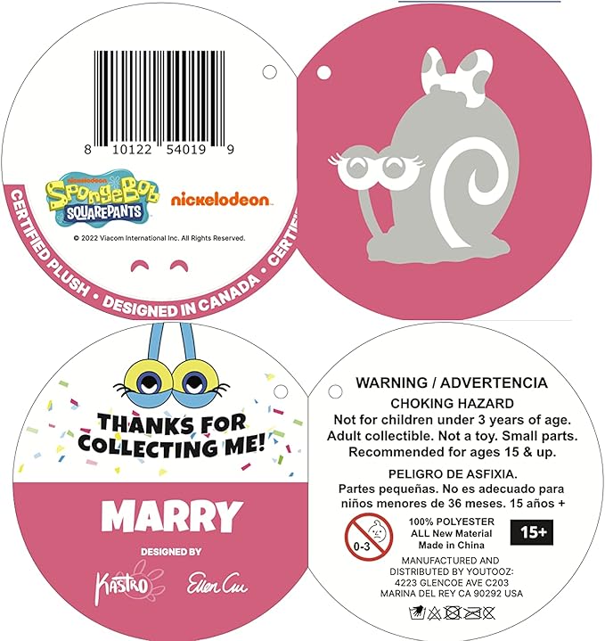 - Youtooz Mary the Snail Soft Plush: This 6 inch Youtooz Spongebob plush snail stickie is stuffed with ultra-soft 100% PP cotton and comes with 4 sewn-in magnets so you can stick them together or onto any magnetic surface.