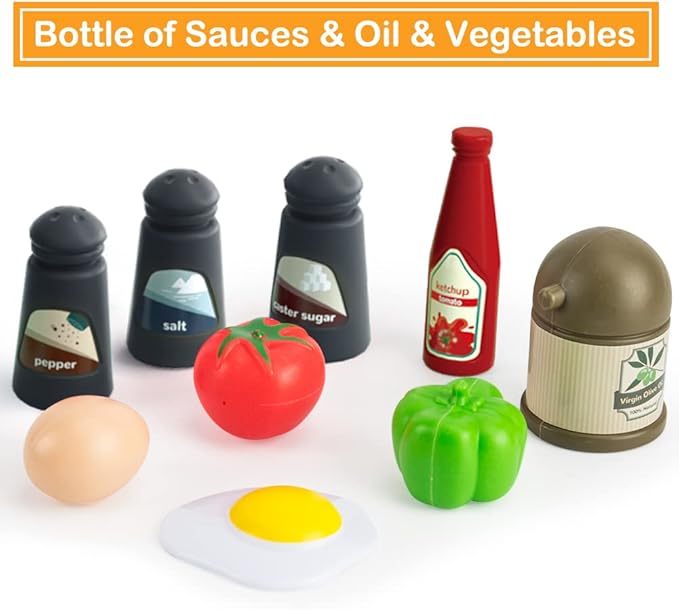 - 【Realistic Kitchen Playset & Food】Realistic cooking set encourages imagination, dexterity, and creative play, Teaches your little ones to be mother's little helper. The kettle can be filled with water and the spout can be pulled out, Give your child a gift that creates countless happy moments!