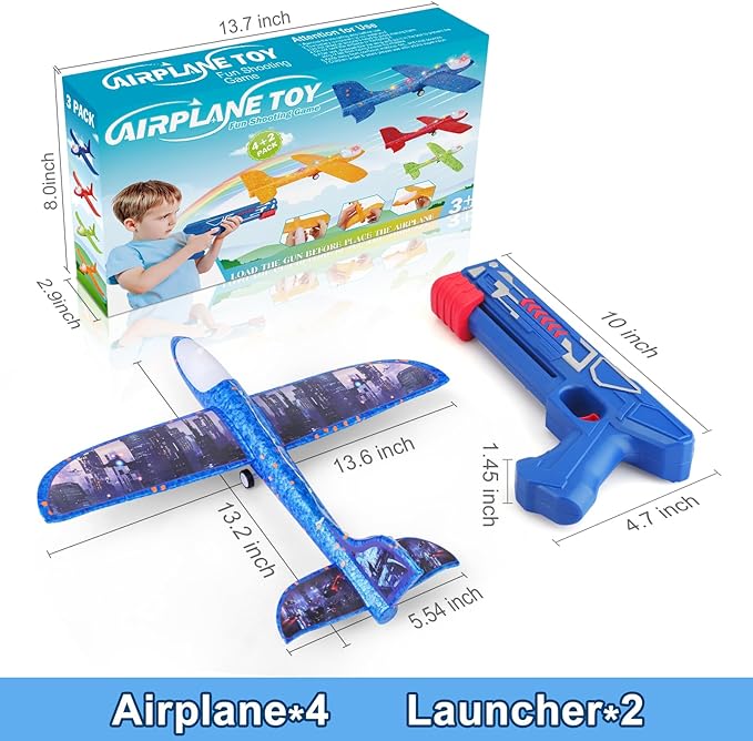 - 4 Pack Airplane Toys - Our air plane boy toy is equipped with 4 different colors of green, orange, red and blue gliding foam planes, and 2 plane launcher. Throwing planes by hand or flying them with launcher, kids can cultivate their hand-eye coordination, observation, and sense of direction.