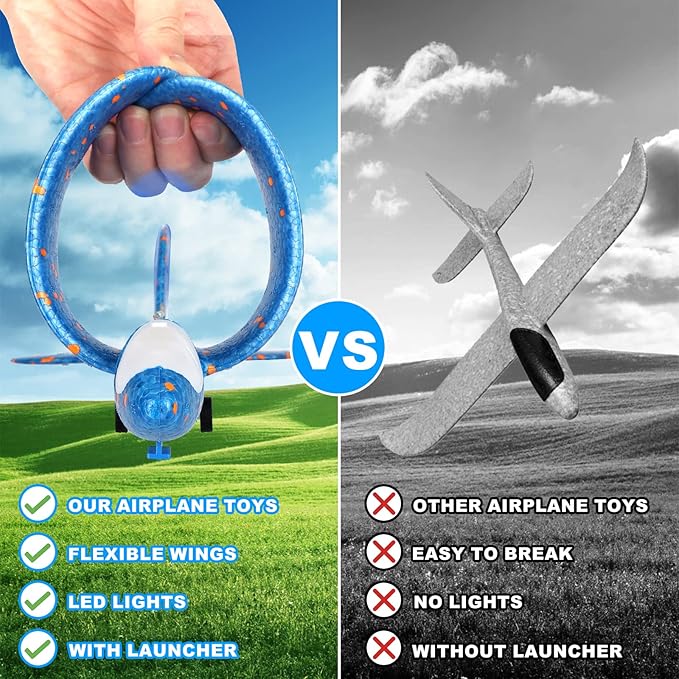 - Safe & Fun for Play - Flying airplane is made of molded foam, safe, bendable, and will not harm kid's hands or feet, and comes with colorful LED lights, kids can enjoy the fun of flying toys even at night. Strong warranty, plz contact seller directly first for any problem you suffered, we will solve it perfectly for you.