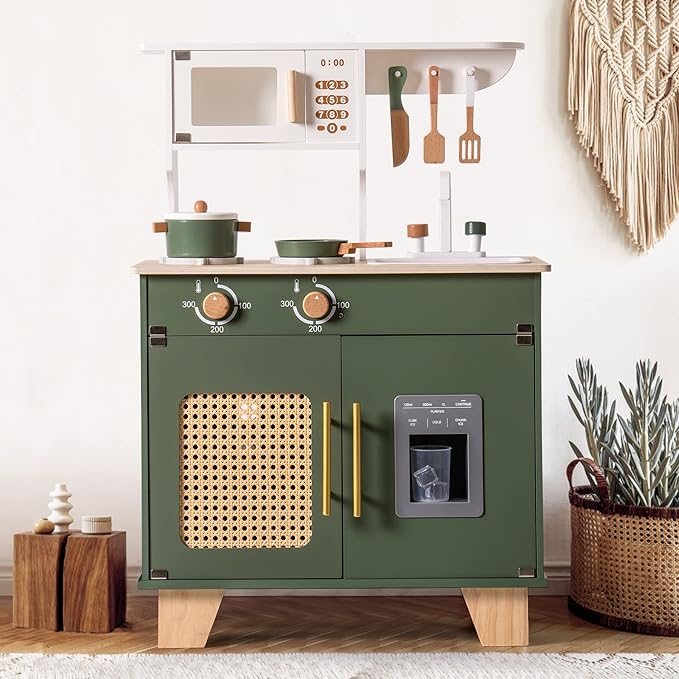 ROBOTIME Play Kitchen with Pretend Ice Cube Dispenser for Toddler, Wooden Kids Kitchen Play Set, Toy Kitchen Set for Kids Age 3 4 5 6 7 (Vintage Green)