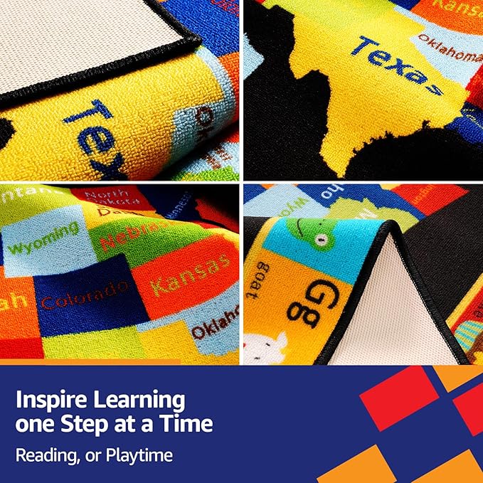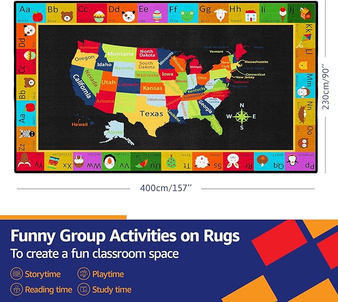 - Safety First --- All ABCarpet usa map educational classroom rug meet Class One Fire rating, and have passed the 16CFR1630 FF 1-70 flame resistance test and OEKO-TEX STANDARD 100, meet stringent safety standards for usa map learning classroom rugs. For your safe use, each reading playmat undergoes rigorous inspection with a needle detection machine to ensure there are no broken needles or debris