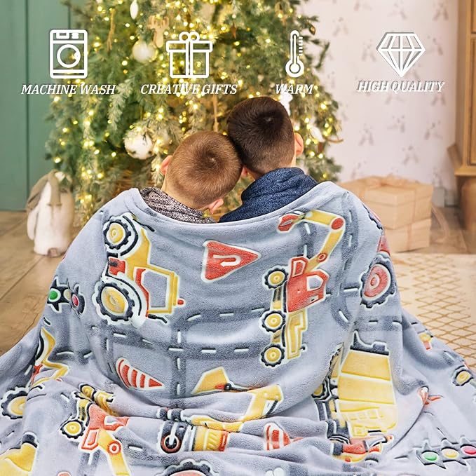 - 【Everyone Will Love It】The comforting grey color is gender neutral for boys and girls, men and women alike. Is there any gifts? Warm body and mind and fall asleep to subtle light emitted by this luminous blanket. This digger tractor blanket is for all construction site fans young and old. This excavator throw is a birthday gifts for any boy or girl that likes tractors, excavators, cement trucks and construction sites in general