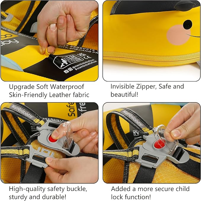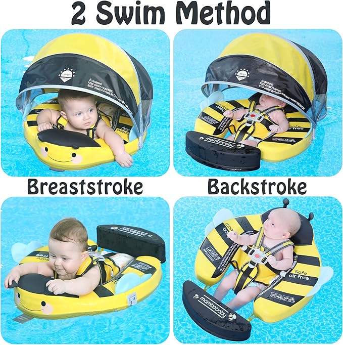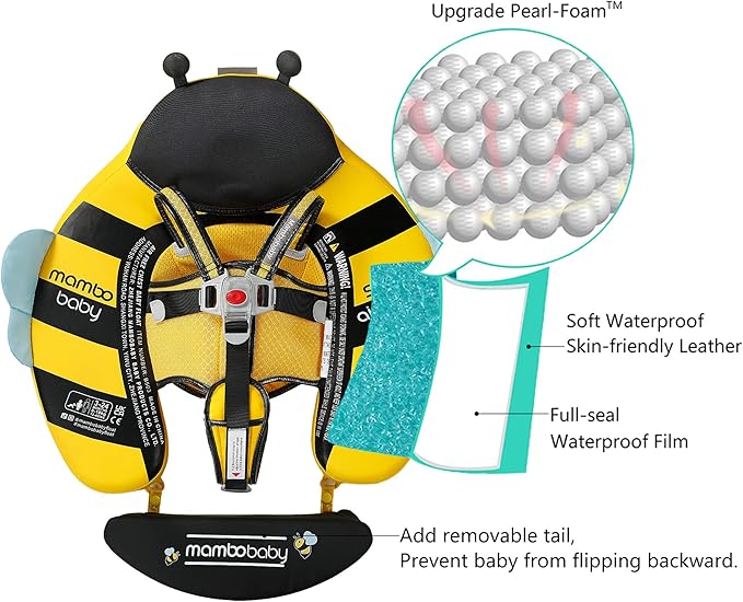 - 【360° FULL PROTECTION】Add removable tail, Prevent baby from flipping backward. Upgraded safety buckle, The Upgraded safety buckle provides 5 support points and perfect 40°angle to keep a balance to avoid baby flip over and fall off. Upgraded into 2 swim ways which are backstroke and breaststroke with different buckle method. Backstroke Suitable for 3~6months baby, breaststroke Suitable for 3~24months baby.