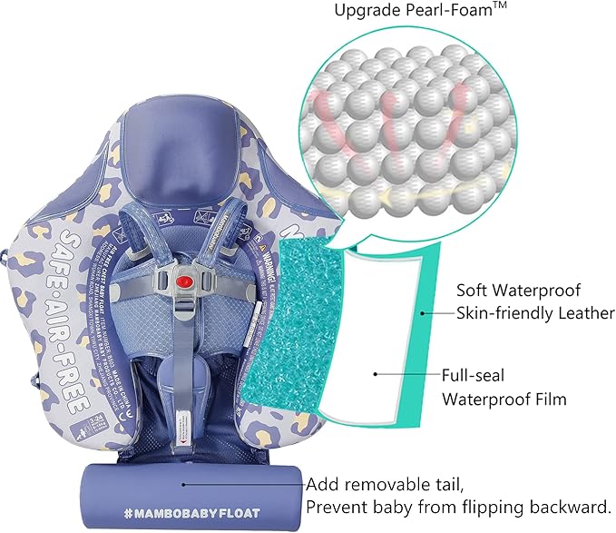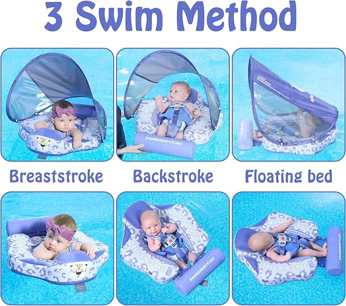- 【360° FULL PROTECTION】Add removable tail, Prevent baby from flipping backward. Upgraded safety buckle, The Upgraded safety buckle provides 5 support points and perfect 40°angle to keep a balance to avoid baby flip over and fall off. Upgraded into 3 swim ways which are backstroke, breaststroke and Floating Bed with different buckle method. Backstroke Suitable for 3~6months baby, breaststroke Suitable for 3~24months baby, Floating Bed Suitable for 3~6months baby.