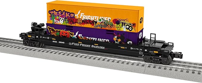 - PRODUCT: Expand your Halloween layout with the Lionel Halloween Graffiti Maxi-Stack O Gauge Model Train Flatcar with Container Load.