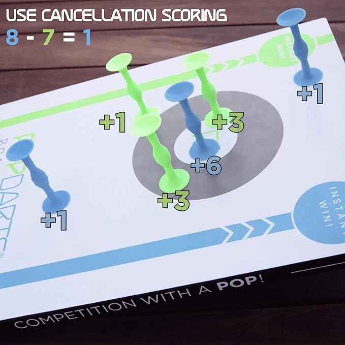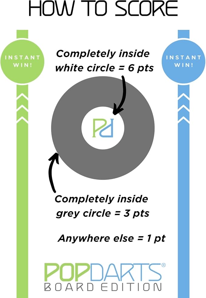 - HOW TO SCORE (If you like pictures, see explanation in photos): Each Popdart completely inside the white PD circle = 6 points. Each Popdart completely inside the grey circle = 3 points. It can be touching the white inner circle. Every other Popdart that sticks on the board = 1 point. Use "Cancellation Scoring". Each player gets three "Instant Win" attempts per game. Play multiple rounds. The first team to reach 21 or more points WINS!