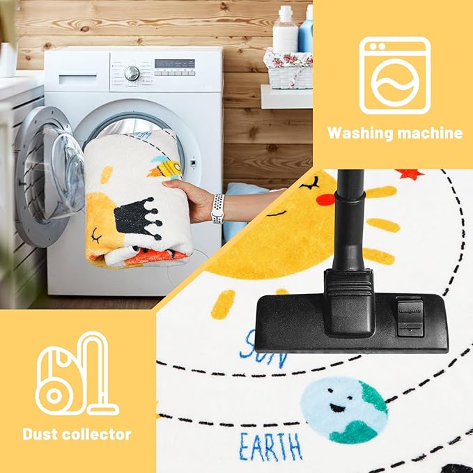 - 【Solar system Rug with Alphabet Design】This 5.2ft circle kids play carpet is designed with cute solar system image and 26 letter patterns, cultivate baby's recognition of the brief letters of the basic study,making this soft bedroom rug both a cartoon playmat and an educational and learning area rug.The cute elements and images of this soft baby crawl mat also make the children's room a lively space, perfect for kids playroom decor, nursery decor and photography props.