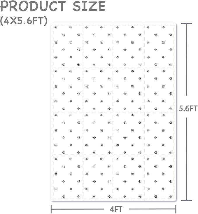 - Large play mat: Our 4 x 5.6 ft. foam tiles make a large puzzle play mat for baby, which is an easy setup and takedown. Each playmate contains 16 Interlocking tiles and edges.